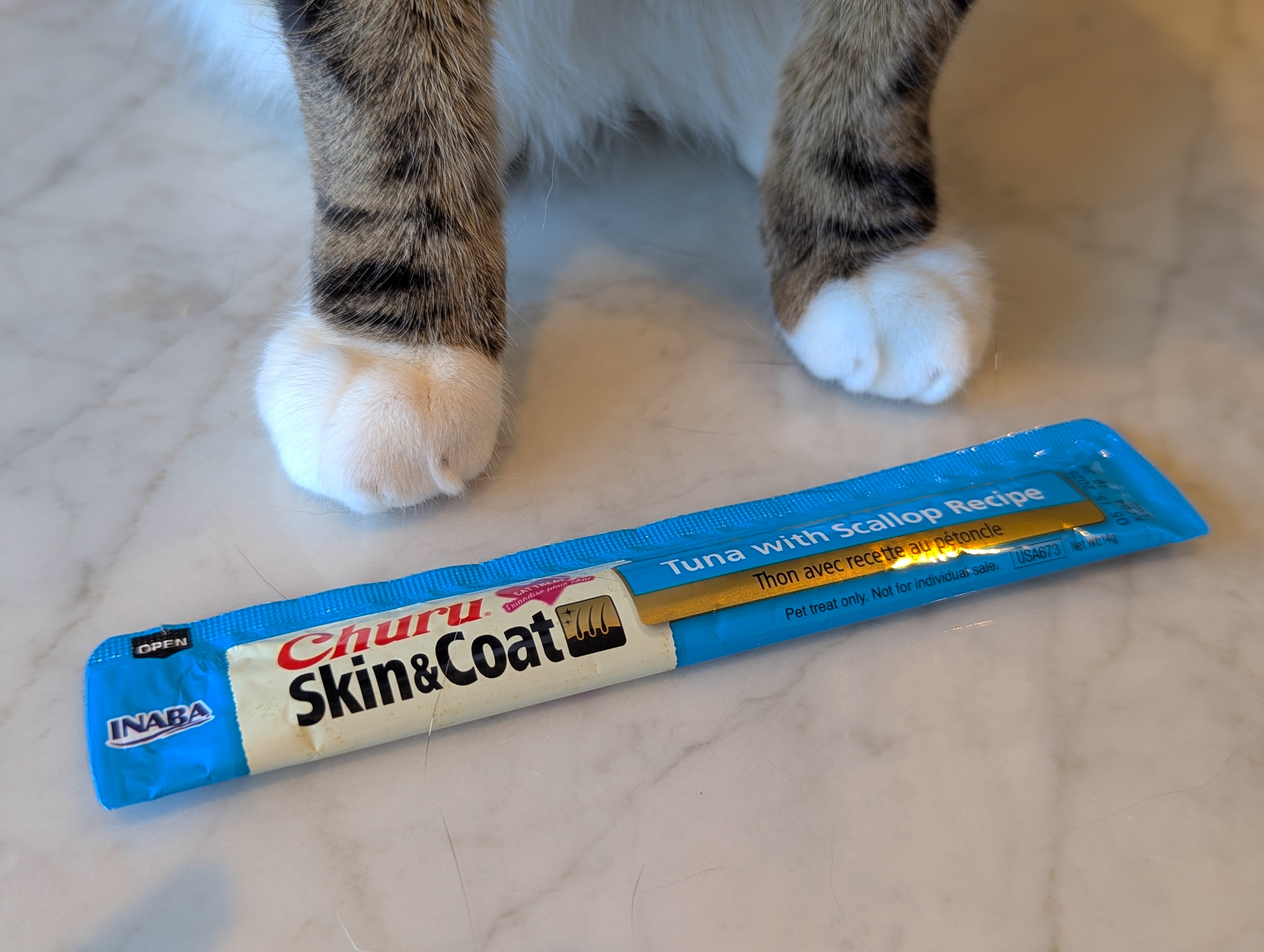 Today, we’re taking a look at Inaba Churu Skin and Coat – Tuna with Scallop creamy treat. Although we’re looking at the tuna and scallop formula, the skin and coat product line comes in a variety of different flavours. So if tuna and scallop doesn’t tickle your cat’s fancy, they have plenty of delicious flavour variants like tuna or chicken with scallop.